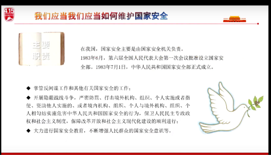 首先,朱丹仪带领全班同学学习有关国家安全的知识,学习到国家安全是什么,如何维护国家安全,倡导同学们积极参加全省大学生国家安全知识竞赛,积累知识,深入实践。