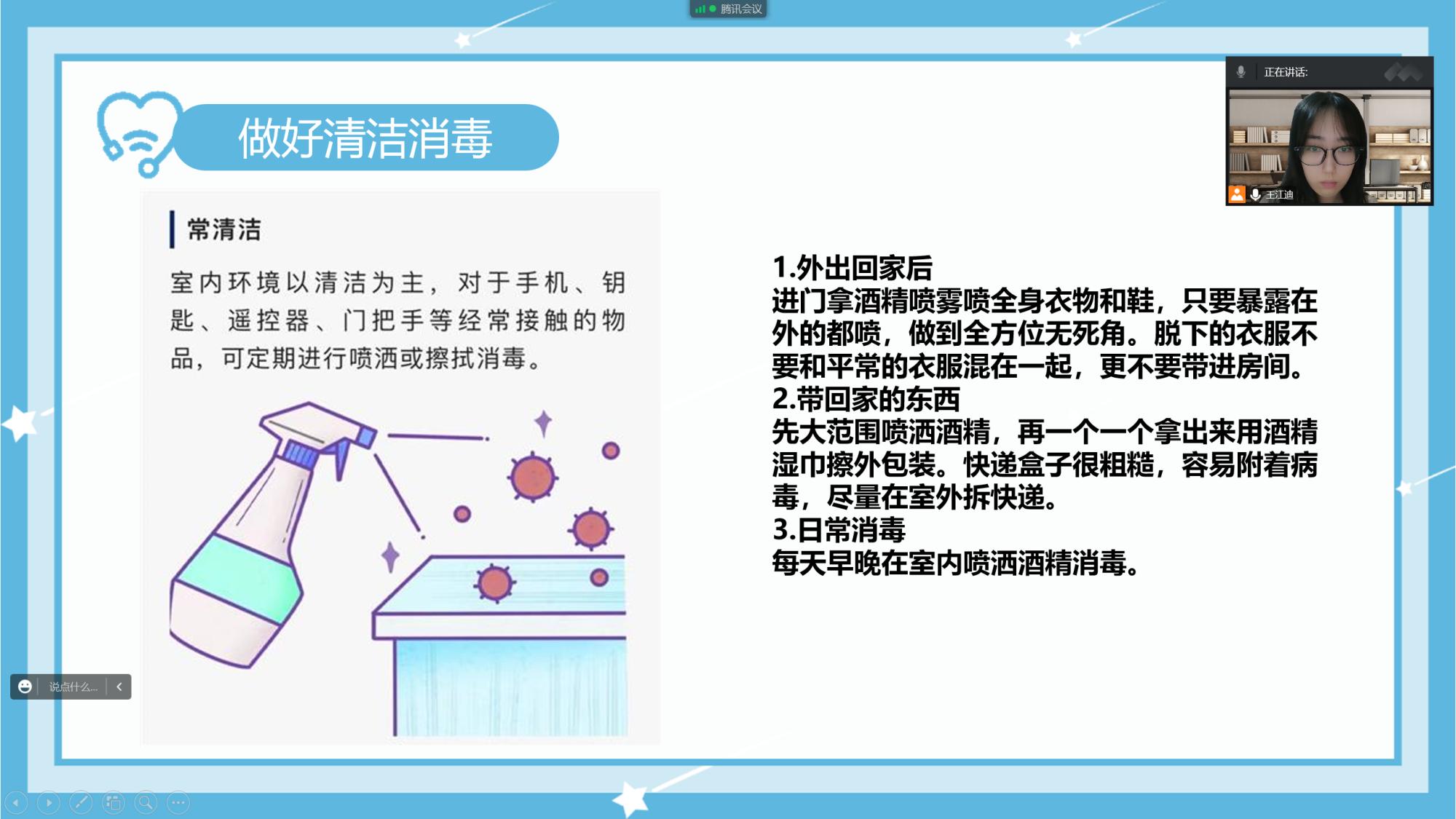 本次讲座分为“预防”、“治疗”以及“康复”三个方面。王江迪同学首先介绍了新冠病毒的由来及传播途径,随后讲解了一些日常防护措施以及人员出行居家的注意事项。其次介绍了新冠居家治疗人员自我管理基本要求和结束居家治疗的条件。最后,明确了康复的标准,分享了康复后的场所消杀以及自我恢复训练的方式、方法。