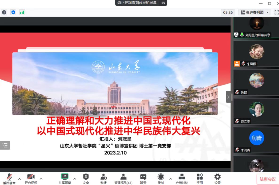 为促进青年党员深入学习习近平新时代中国特色社会主义思想,深刻领会和准确把握党的二十大精神的科学内涵和核心要义,2月10日,taptap点点官方网站taptap点点官方网站“星火”硕博宣讲团以“正确理解和大力推进中国式现代化,以中国式现代化推进中华民族伟大复兴”为题开展主题宣讲活动。博士第一党支部支部书记刘冠呈担任主讲人,2021级、2022级党支部全体学生党员参与学习。
