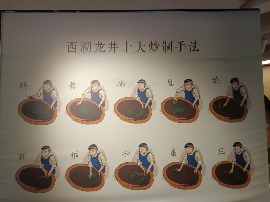 紧接着,团队成员们了解到近日由西湖风景名胜区管委会联合杭州市农业科学研究院举办的2024年龙井茶炒制研修班刚刚落下帷幕,便向工作人员虚心请教,学习并亲身体验了炒茶制作工艺。炒茶师傅在提到炒制乌龙茶的诀窍时说到:“经得住高温,耐得住寂寞,守得住初心”,这十二字箴言,不仅是炒茶师傅们炉火纯青技艺背后的精神支柱,也是龙井茶内在灵魂的真实写照。它寓意着在每一次翻炒之间,都蕴含着对品质的极致追求与对传统的坚定守护。高温之下,茶叶历经蜕变,正如龙井茶人面对挑战不屈不挠,勇于探索;寂寞之中,他们坚守岗位,日复一日,年复一年,只为那一抹清香能够穿越时空,触动人心;而初心,则是他们始终如一的信念,让每一杯龙井茶都承载着自然的馈赠与人文的情怀。在确保安全的前提下,同学们亲手感悟到了茶叶与高温的反应,炒出了属于自己的茶叶。