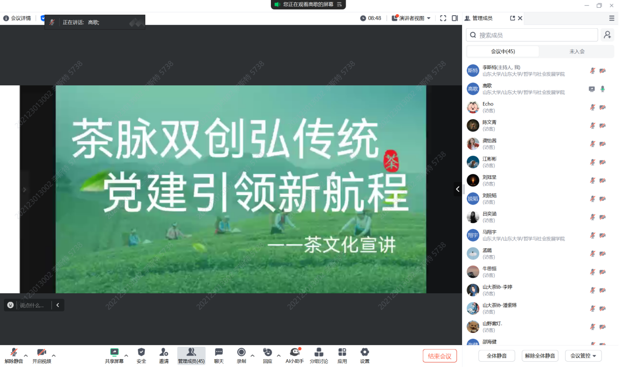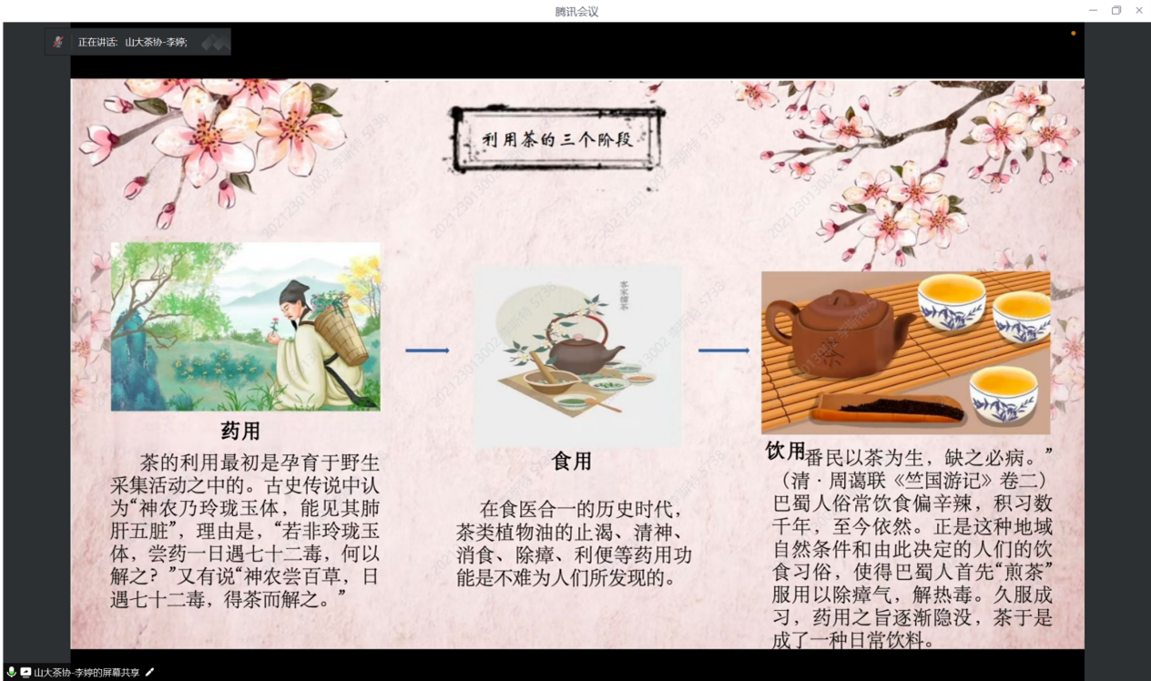 8月12日下午,taptap点点官方网站“星火”学生党员先锋队成功举办了一场别开生面的线上茶文化宣讲会。本次活动旨在弘扬中华优秀传统茶文化,促进文化创新与交流,吸引了包括taptap点点官方网站茶文化协会代表在内的五十余名学生及茶文化爱好者积极参与,共同探索茶文化的深厚底蕴与现代价值。