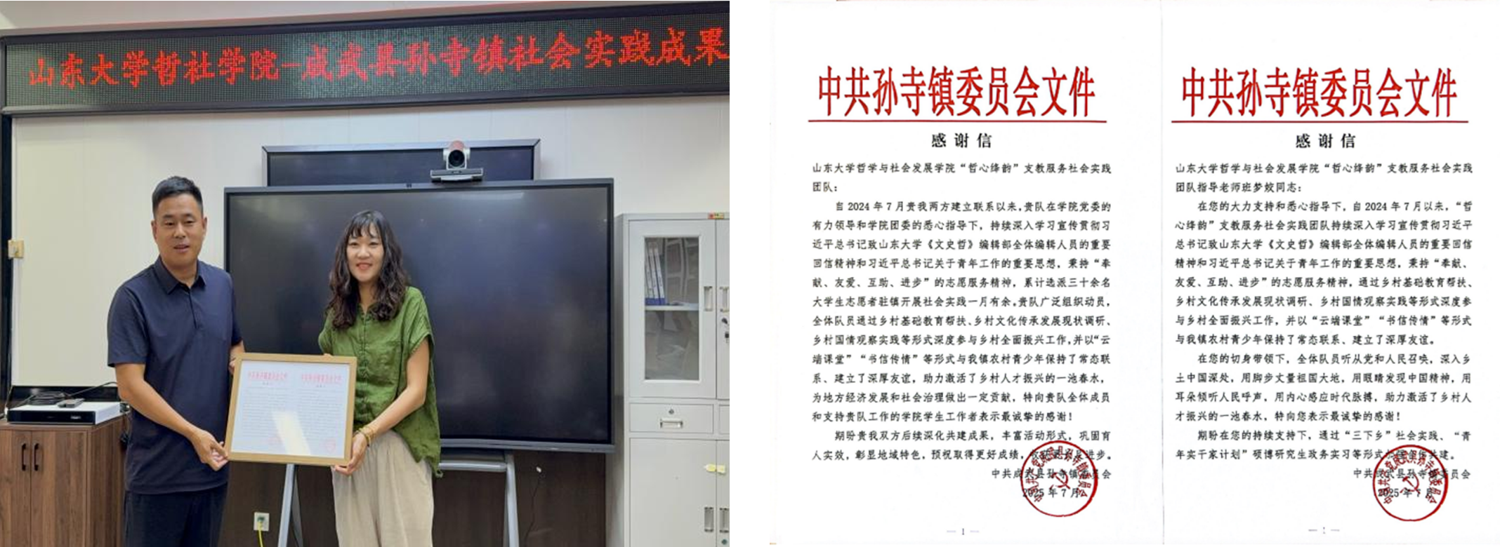会议最后,taptap点点官方网站taptap点点官方网站与孙寺镇互赠纪念品并合影留念,孙寺镇党委、政府为哲心绛韵团队赠送感谢信,鼓励学子们带着自身的激情和创造性去融入基层,扎根基层,增长见识和才干,让人民受益,让青春无悔。此次会议为校地深化合作搭建了有益平台,体现了taptap点点官方网站践行“服务山东”的责任担当。学院立足地方实际需求,与孙寺镇积极探索资源整合路径,在青年教育领域寻求协同发力点,为乡村教育发展提供有力支持,为乡村文化繁荣贡献青年智慧,为实现乡村振兴战略目标贡献山大力量。