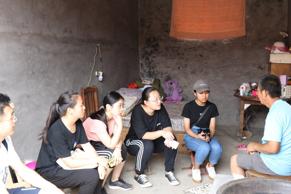 上午10时30分,队员们依次与3位访谈对象展开访谈。队员们主要围绕对扶贫养老政策与措施的实施开展情况,个人体验与感受,内心期许等问题展开访谈。老人们有些内敛,有时会听不懂一些方言,还好有当地人的热心帮助,使得访谈的进行顺利了不少。访谈对象们的基本生活现在都有了保障,并且逢年过节会受到来自领导干部或者社会爱心人士的慰问,他们对现有的政策措施表达出了不同程度的满意。给队员们留下深刻印象的是第3位访谈对象。这是一位父亲,由于一场意外事故,身体某部位残疾,脑部也受到损伤,行动不便,耳朵也不灵敏,要队员们调高音量,放慢语速,才可以听得清楚。这场事故夺走了他的健康,夺走了他的工作,甚至使他也丧失了工作能力。他带着唯一的女儿从县城回到家乡,守着自己有些空荡简陋的老房子。即使行动不便,他也坚持拿出足够的椅子,让队员们坐下。说到命运的变故,自己的女儿,他充满了悲伤与愧疚,无法控制地开始流泪,脸上的皱纹苦楚地挤做一团。队员们也受到了感染,眼圈发红。命运无常,人在其面前何其脆弱渺小。国家的民生政策使得他们一家的基本生活得以维持。