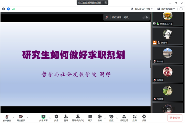 针对“研究生如何做好求职规划”,阚铮从就业形势分析、明晰求职目标、制定求职计划和自我管理与调整四个方面展开。在就业形势分析上,她结合具体数据帮助同学们分析了疫情以来大学生的求职特点以及目前就业市场的转变趋势,同时指出新业态、新城市、新政策的出现意味着众多机遇,提醒同学们要考虑市场需求变化、重视人岗匹配、提升综合素质、尽早准备就业;在目标的选择上,阚铮通过列举往届毕业生的就业案例,引导同学们摒弃从众心理,避免求全、求稳、求易等决策误区,综合考虑个人志向与兴趣、专业特色、社会经验、家庭资源与环境等方面因素,逐步确认自身求职目标;在制定求职计划上,阚铮具体介绍了个人能力提升路径,基于我院各个学科的专业特色举例说明了各学科学生的专业优势所在,引导同学们运用STAR-L法则梳理自己的过往经历,挖掘自身能力和特长,找到自身的闪光点。