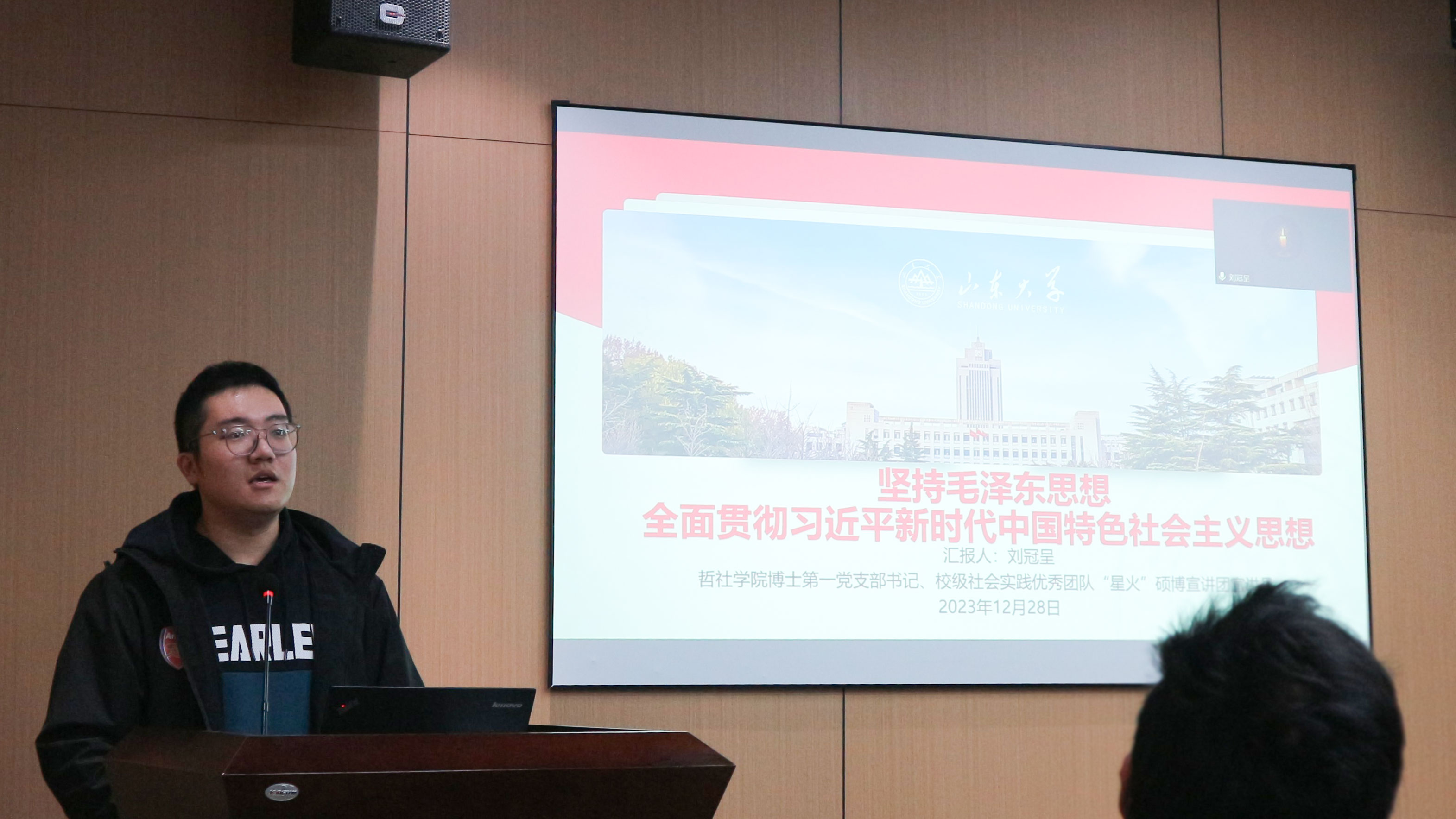 刘冠呈同志结合自己的专业,以《坚持毛泽东思想 全面贯彻习近平新时代中国特色社会主义思想》为题做宣讲报告,并同与会同志进行交流。汇报分为三大部分。刘冠呈同志首先从习近平总书记在纪念毛泽东同志诞辰120周年和130周年两次座谈会上的对毛泽东同志评价的不同侧重点出发,与大家一同探讨了如何正确理解毛泽东思想。在此基础上,他表示要辩证地看待毛泽东思想,并简要概括了自己对毛泽东思想的深刻理解。最后,刘冠呈同志以全面贯彻习近平新时代中国特色社会主义思想、以中国式现代化全面推进中华民族伟大复兴为主题,呼吁广大党员同志要做助力民族复兴、担当时代重任的时代新人。