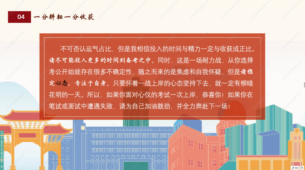 薛学姐结合自身经历分享了公考经验和备考计划。她指出,笔试的备考要注重公共基础知识、行测与申论均衡复习、同步推进。针对面试,薛学姐指出既要重视外在形象,也要注重内在修养,做到言之有物。最后,她勉励同学们稳定心态,专注自身,静待“柳暗花明”。