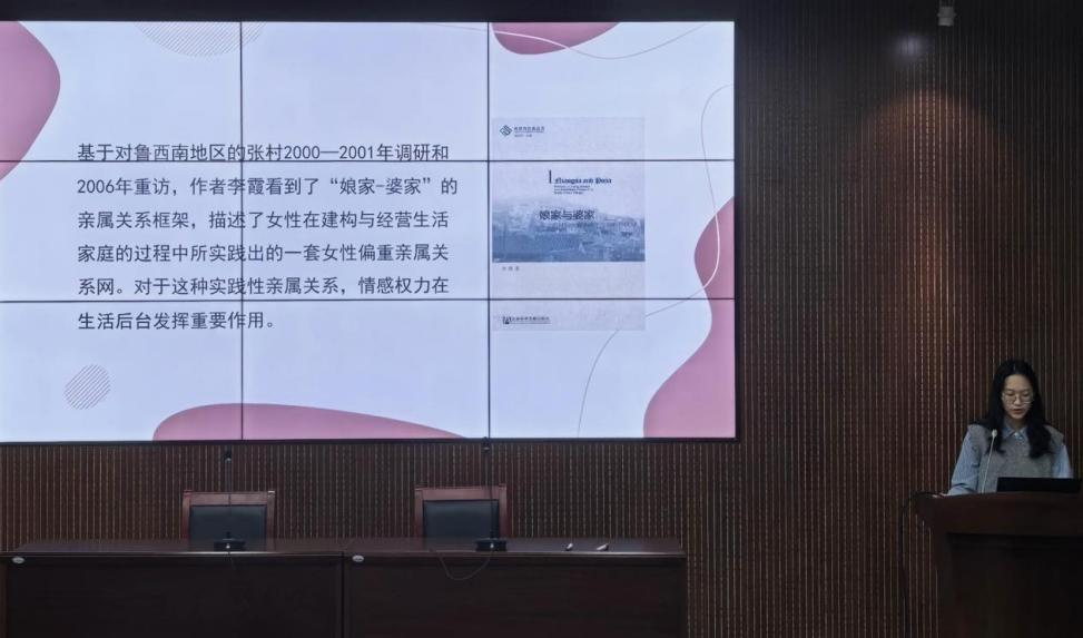 本次读书会汇聚了来自哲学、社会学等多个学科领域的12位同学,他们以独到的视角和深刻的见解,对“《娘家与婆家》:女性亲属实践中的生活家庭与情感权力”、“论精神科学的真理概念——以伽达默尔哲学诠释学为中心的探究”等多元学术议题与阅读方法进行了精彩报告。其中,2024级社会工作专业张琳艳同学聚焦于“娘家-婆家”的亲属关系框架,分享了女性偏重亲属关系网的形成过程与情感权力的作用,并对“性别秩序是否走向瓦解”这一核心议题进一步讨论;2024级中国哲学王娅婷同学分享了莫提默·J.艾德勒在其著作《如何阅读—本书》中提出的阅读方法,她从“为什么要读书”、“怎么读书”、“阅读的四个层次”三个部分梳理本书的内容框架,在与作者的对话中为同学们提供了文献阅读的新思路。12位报告人的精彩分享赢得了在场观众的热烈掌声。