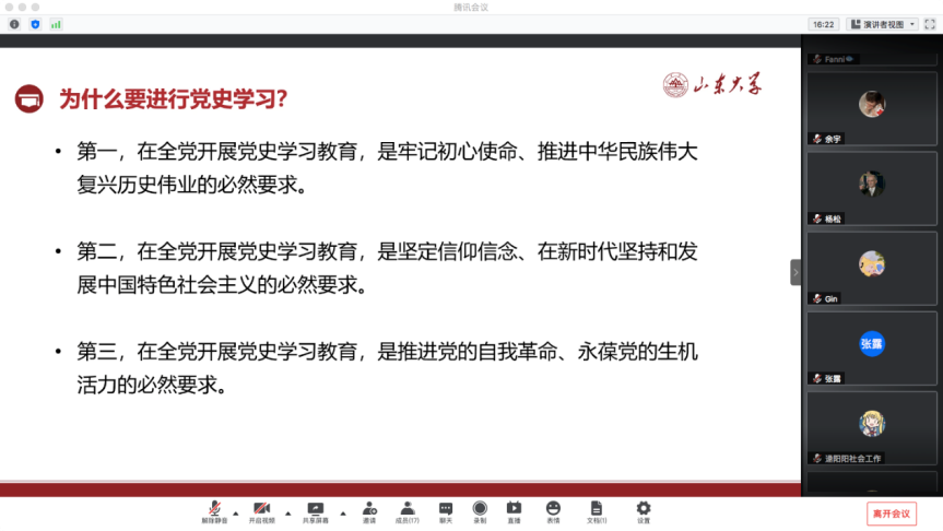 与会党员围绕党史学习,结合自身实际进行了讨论与交流。大家纷纷表示,将深入学习领会习近平总书记在党史学习教育动员大会上的重要讲话精神,贯彻落实党组织关于开展党史学习教育的重要部署,努力做到学史明理、学史增信、学史崇德、学史力行,学党史、悟思想、办实事、开新局,以优异成绩迎接建党百年,山大百廿。