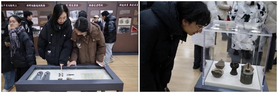 展览设“人民战争的不朽丰碑”“人民战争的深厚伟力”“小推车革命精神永放光芒”三个部分,通过十余件支前文物和百余幅珍贵历史照片,全方位展示了淮海战役的全过程,带领同学们重回革命年代,回顾人民群众支援淮海战役的光辉历史。承载着历史与苦难的文物,人民在风雪中不屈不挠的身影,共同诉说着触动人心的支前线故事。
